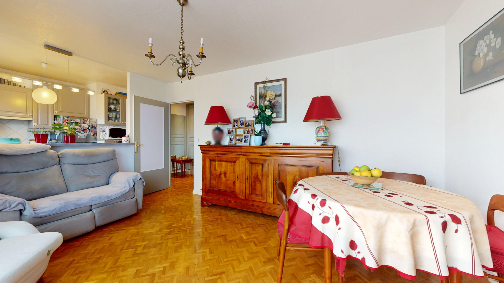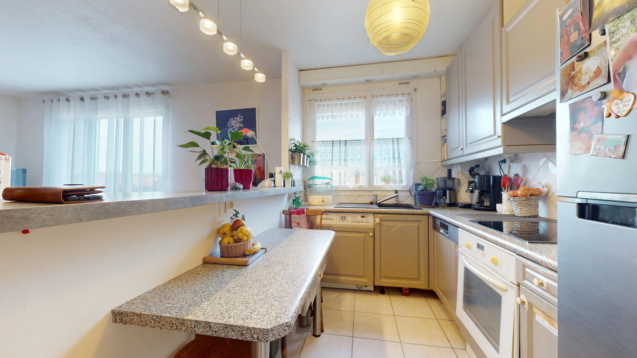 - Un séjour lumineux ouvrant sur un balcon, une cuisine équipée partiellement ouverte,
