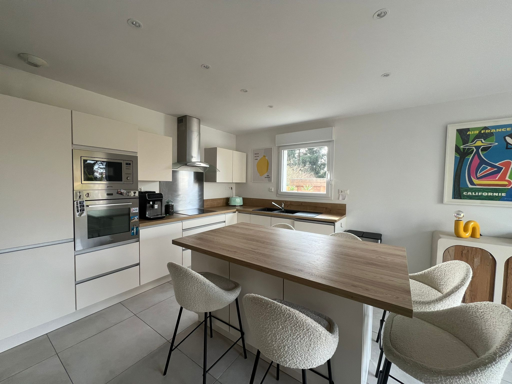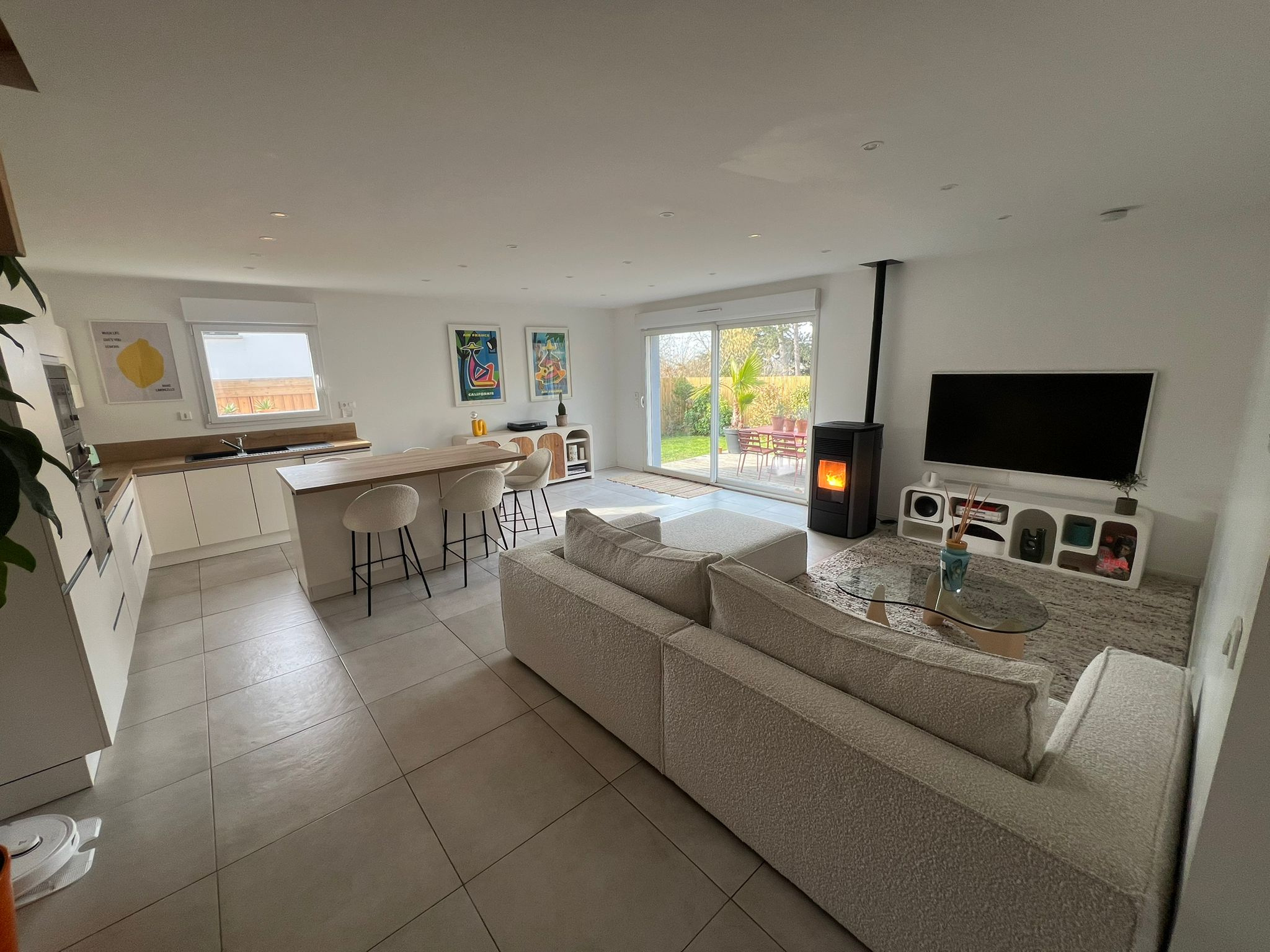 Au rez-de-chaussée, une entrée avec buanderie dessert un séjour double lumineux équipé d’un poêle à granulés, s’ouvrant sur une terrasse orientée plein Ouest. Cuisine américaine contemporaine et équipée. WC séparé avec lave‑mains.