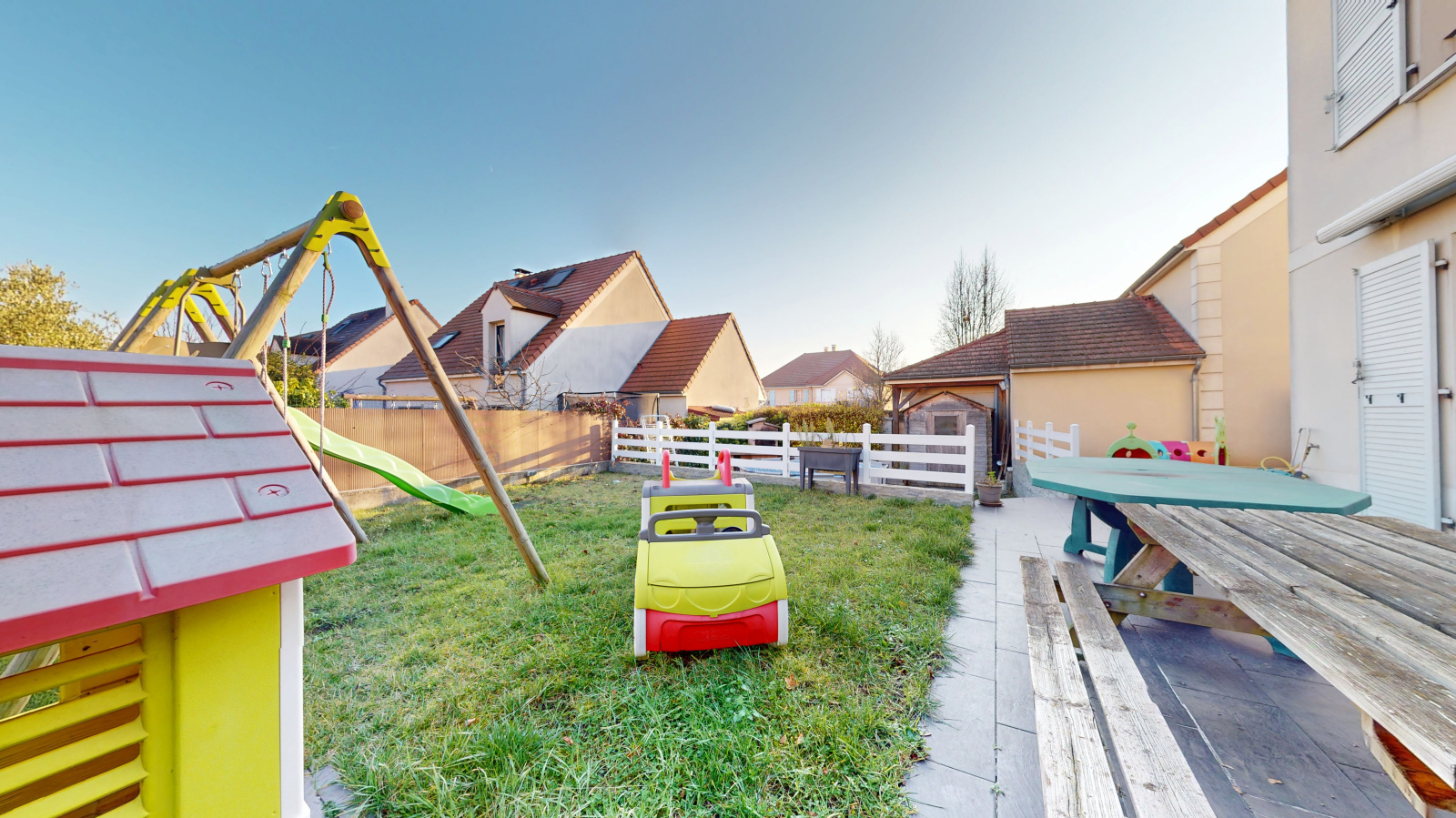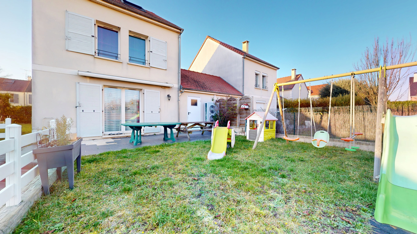 Cette maison fonctionnelle dispose également d'un garage individuel et bénéficie d'une excellente exposition. La gare SNCF (ligne J vers Paris Saint-Lazare en 18 minutes) est accessible en bus ou à pied, rendant les déplacements faciles.