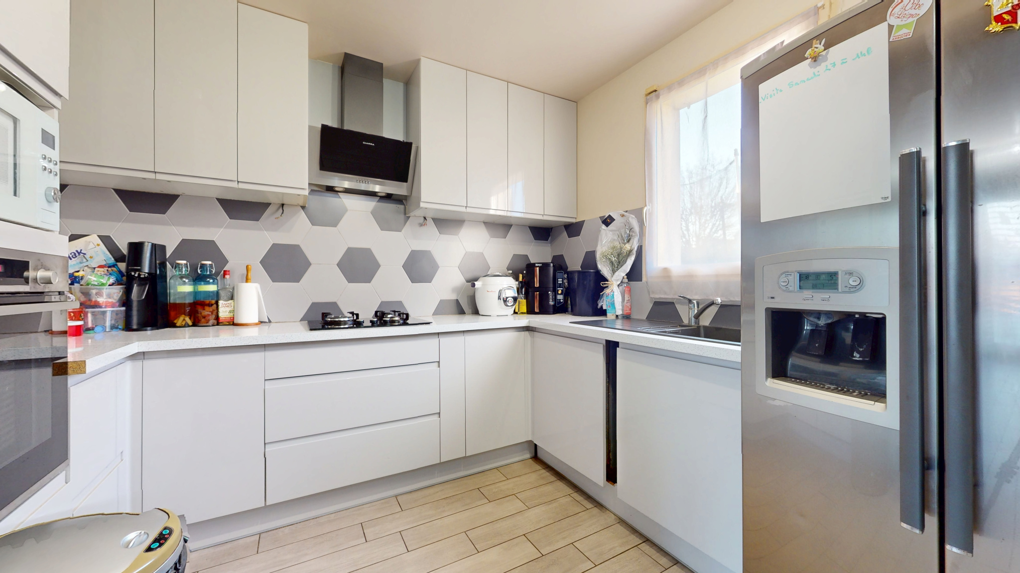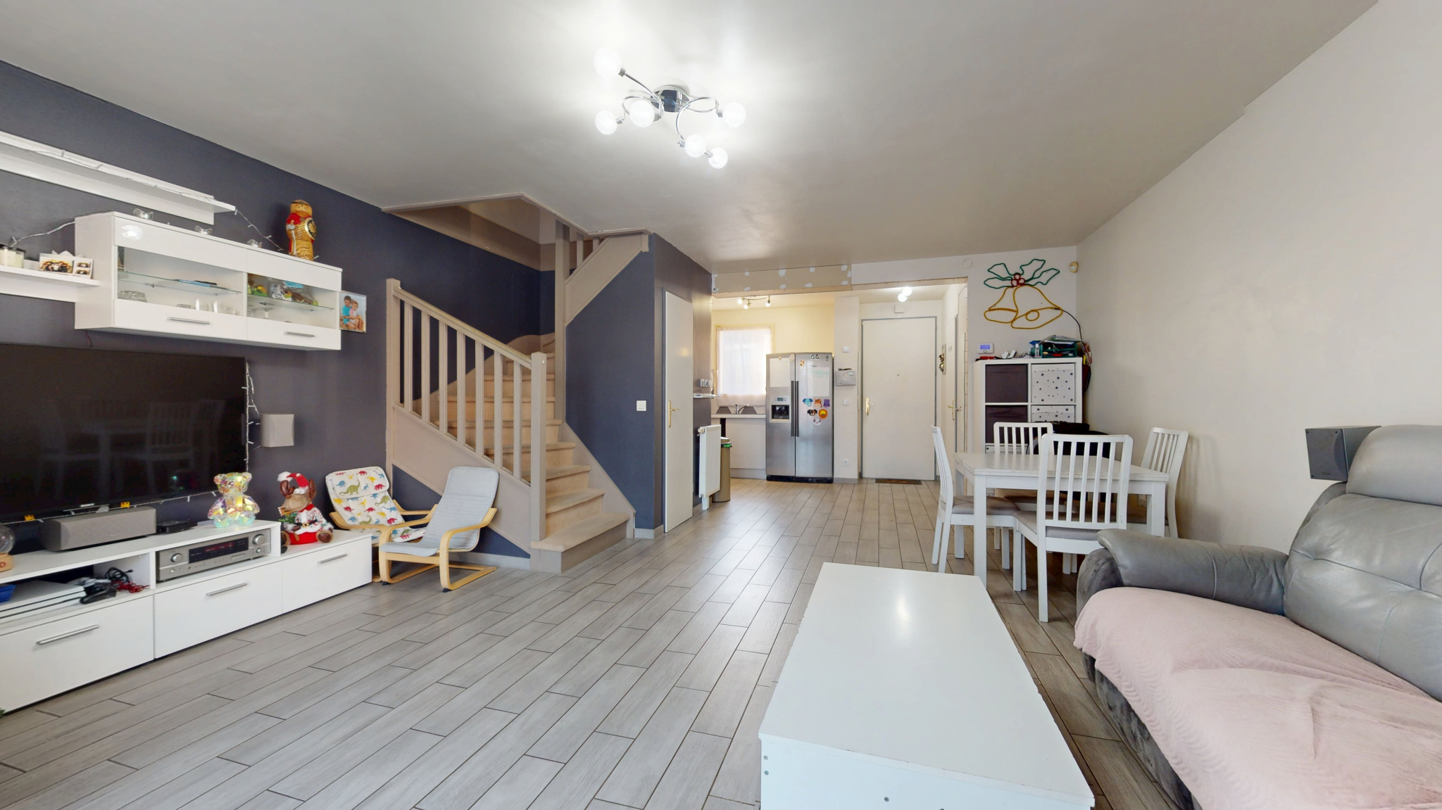 Dès l'entrée, vous apprécierez les WC séparés, puis une cuisine ouverte récente et entièrement équipée qui s'ouvre harmonieusement sur un séjour. Ce dernier donne un accès direct à un agréable jardin avec terrasse, parfait pour profiter des beaux jours en famille ou entre amis.