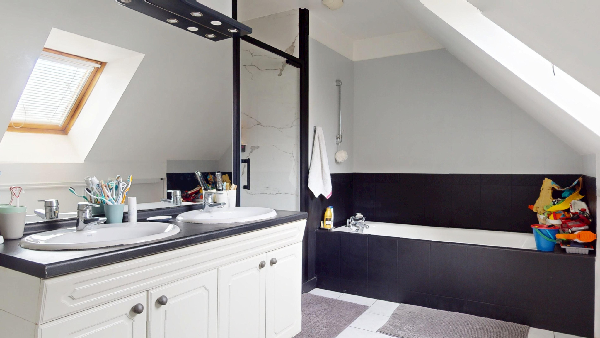 À l’étage : elle vous offre un dégagement desservant trois chambres, une salle de bains avec douche et baignoire, et un WC séparé.