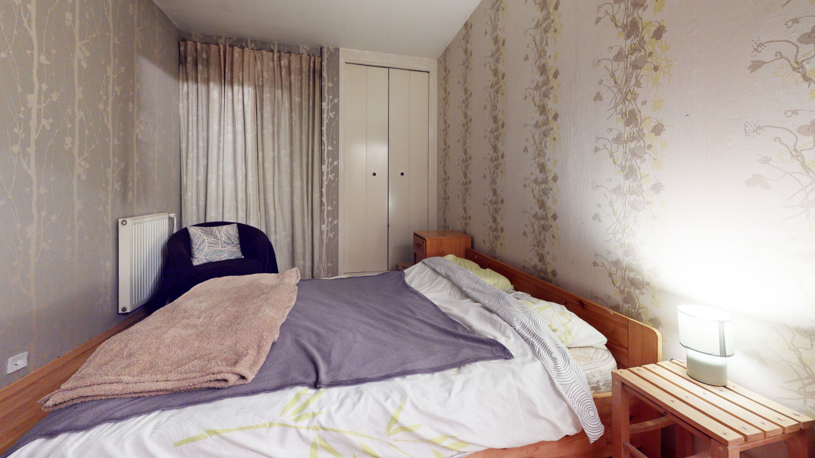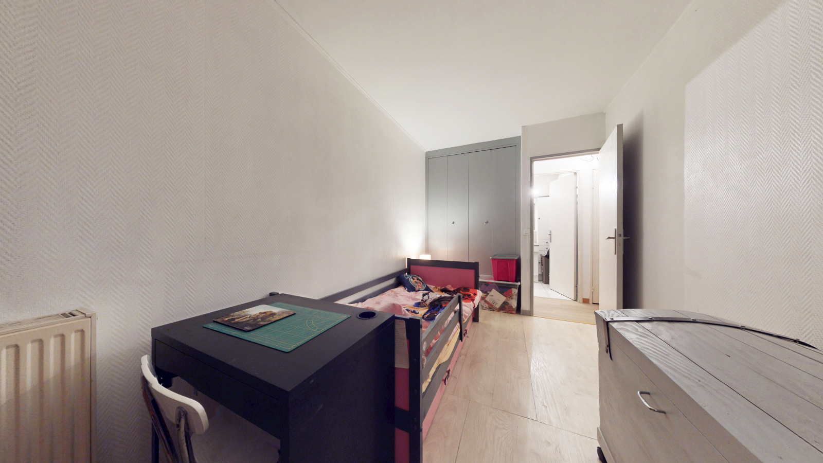 L’espace nuit comprend deux chambres avec rangements, une salle de bains et des WC séparés.