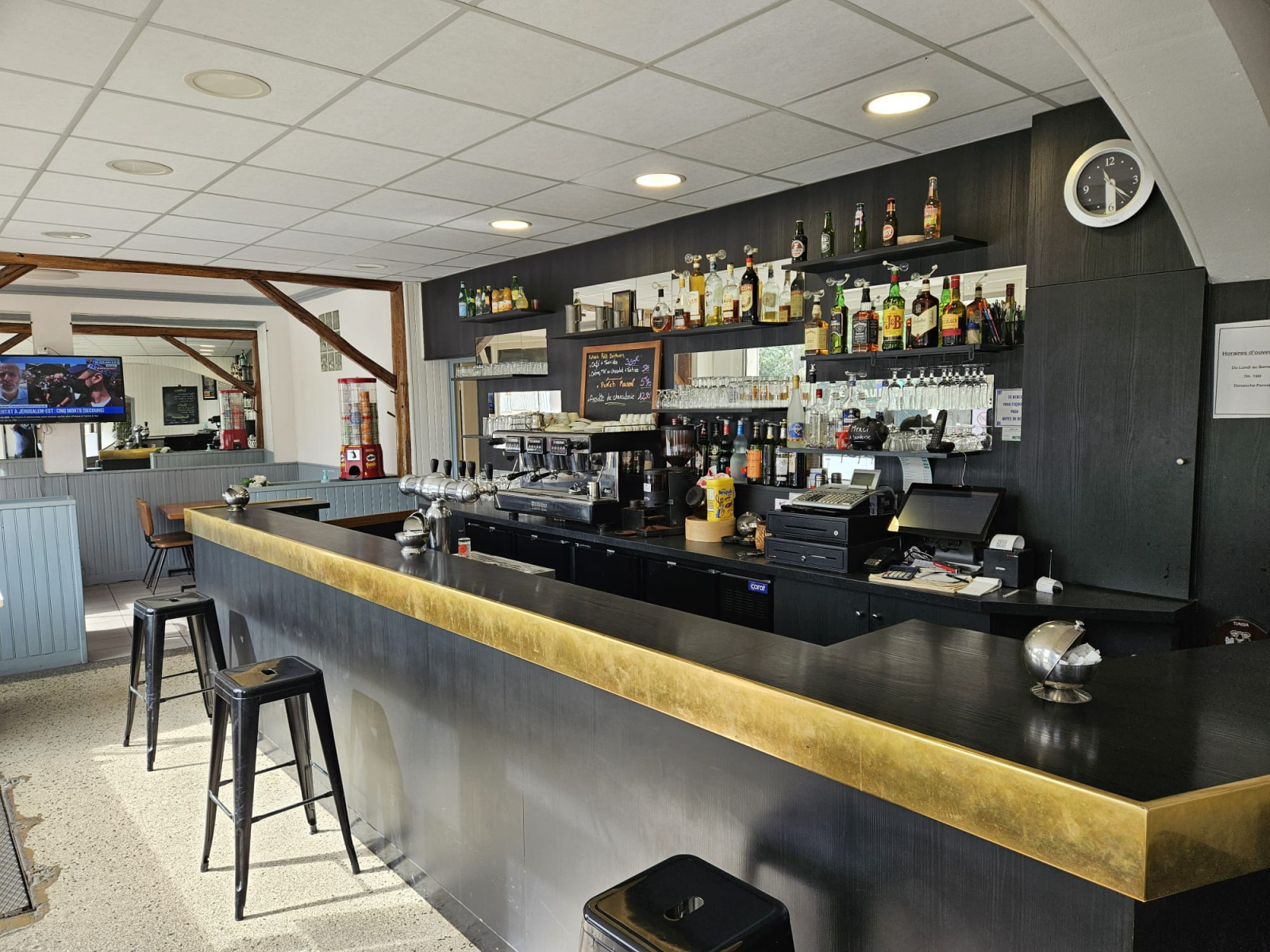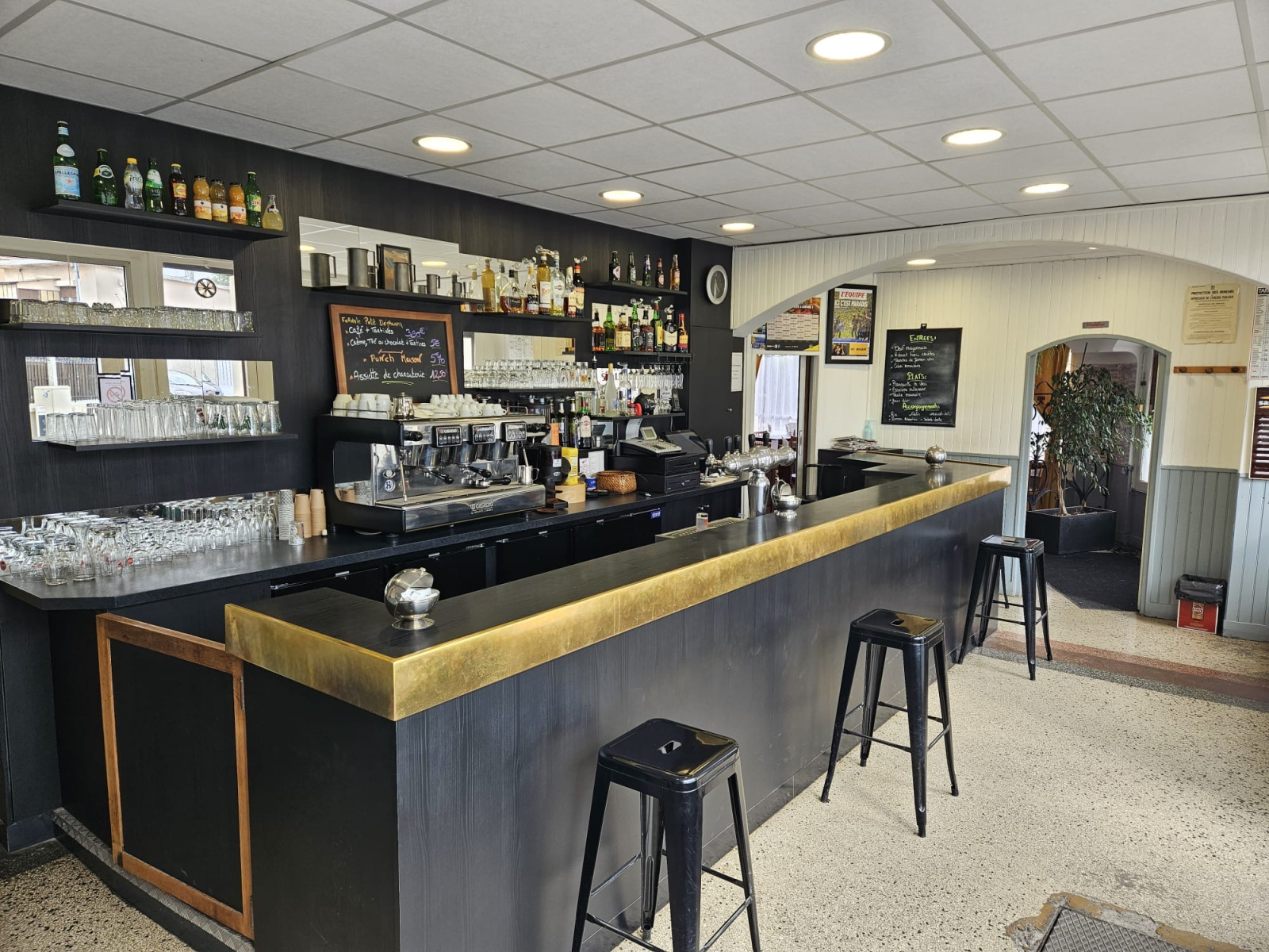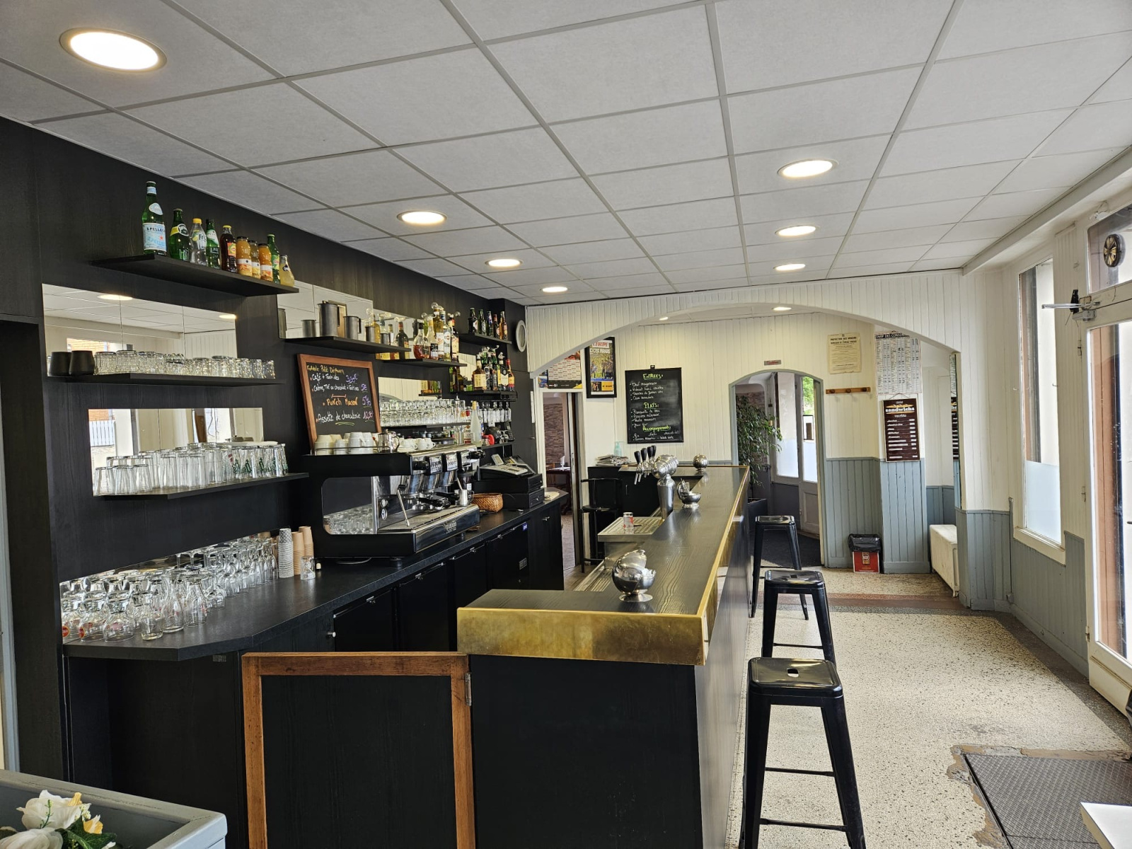 Un bar de 40 m² avec comptoir de 6 mètres linéaires, 20 places assises et sanitaires,