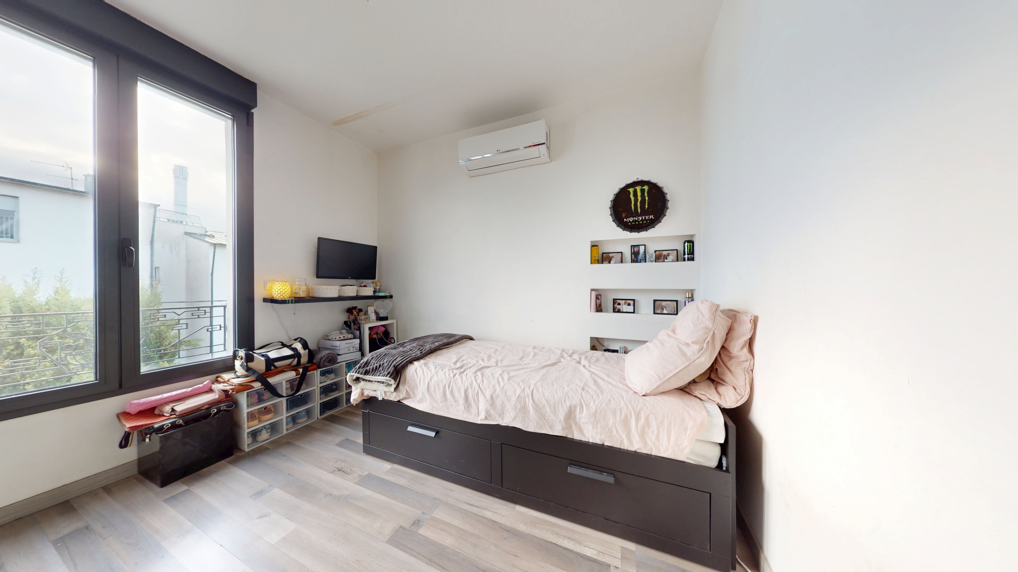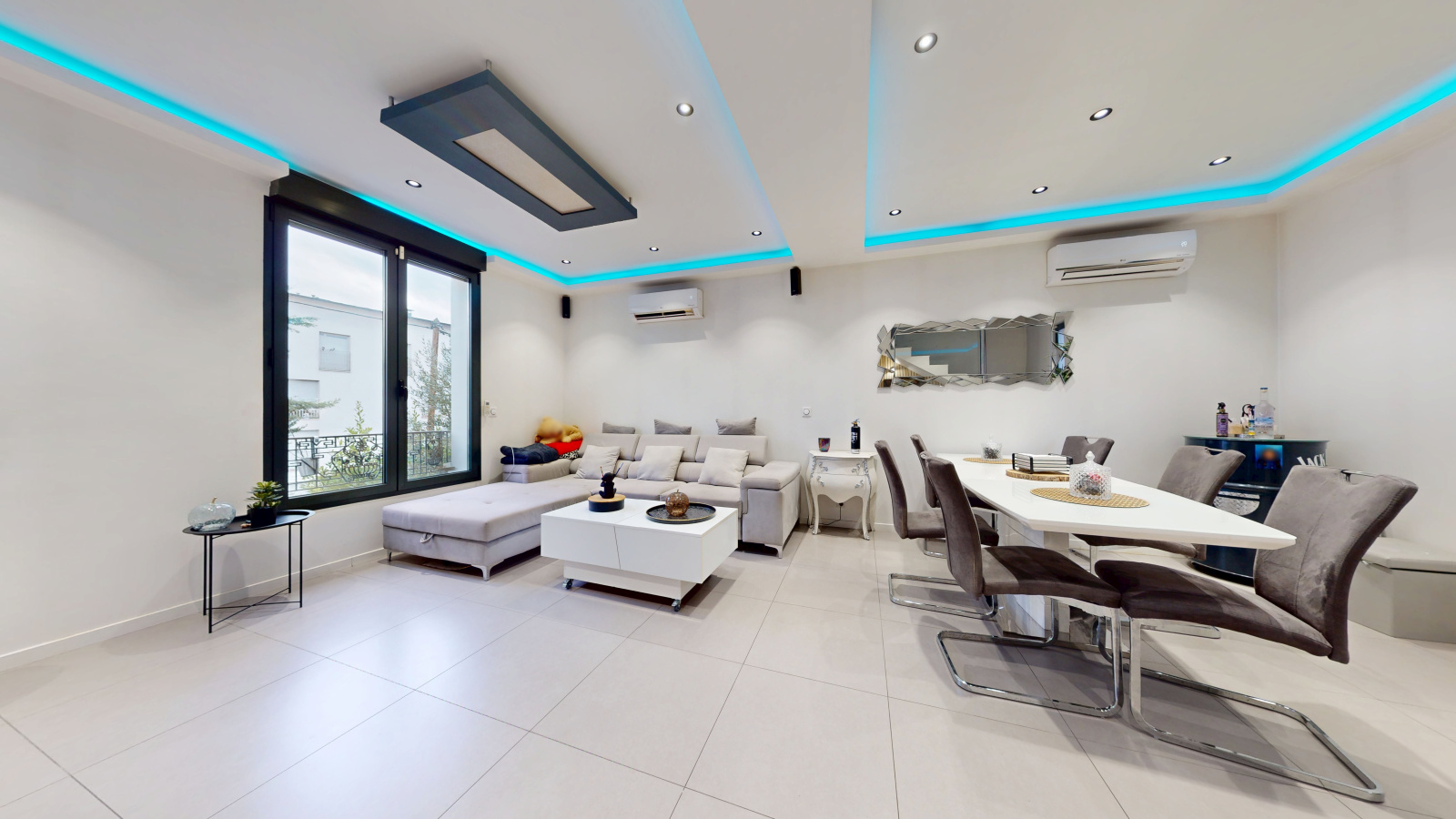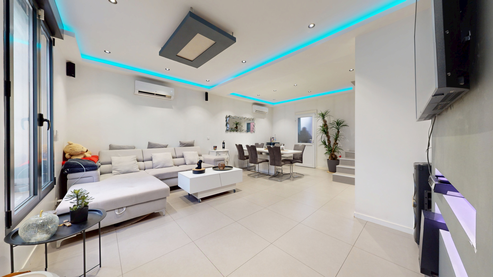 Le rez-de-chaussée surélevé accueille un séjour lumineux avec salle à manger aux volumes agréables.