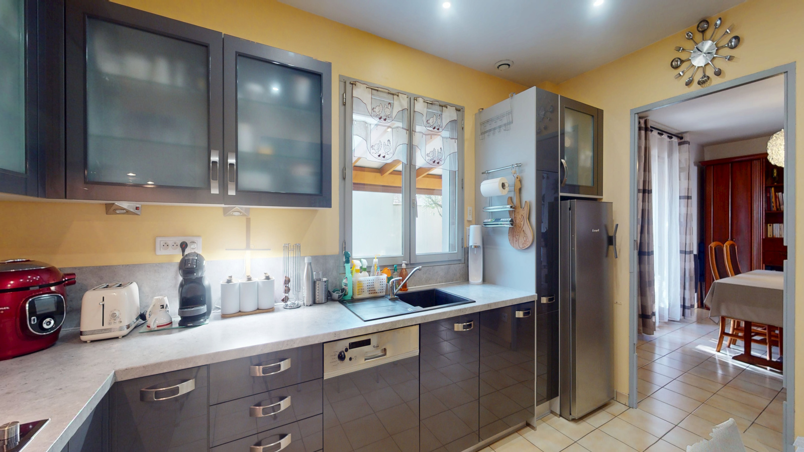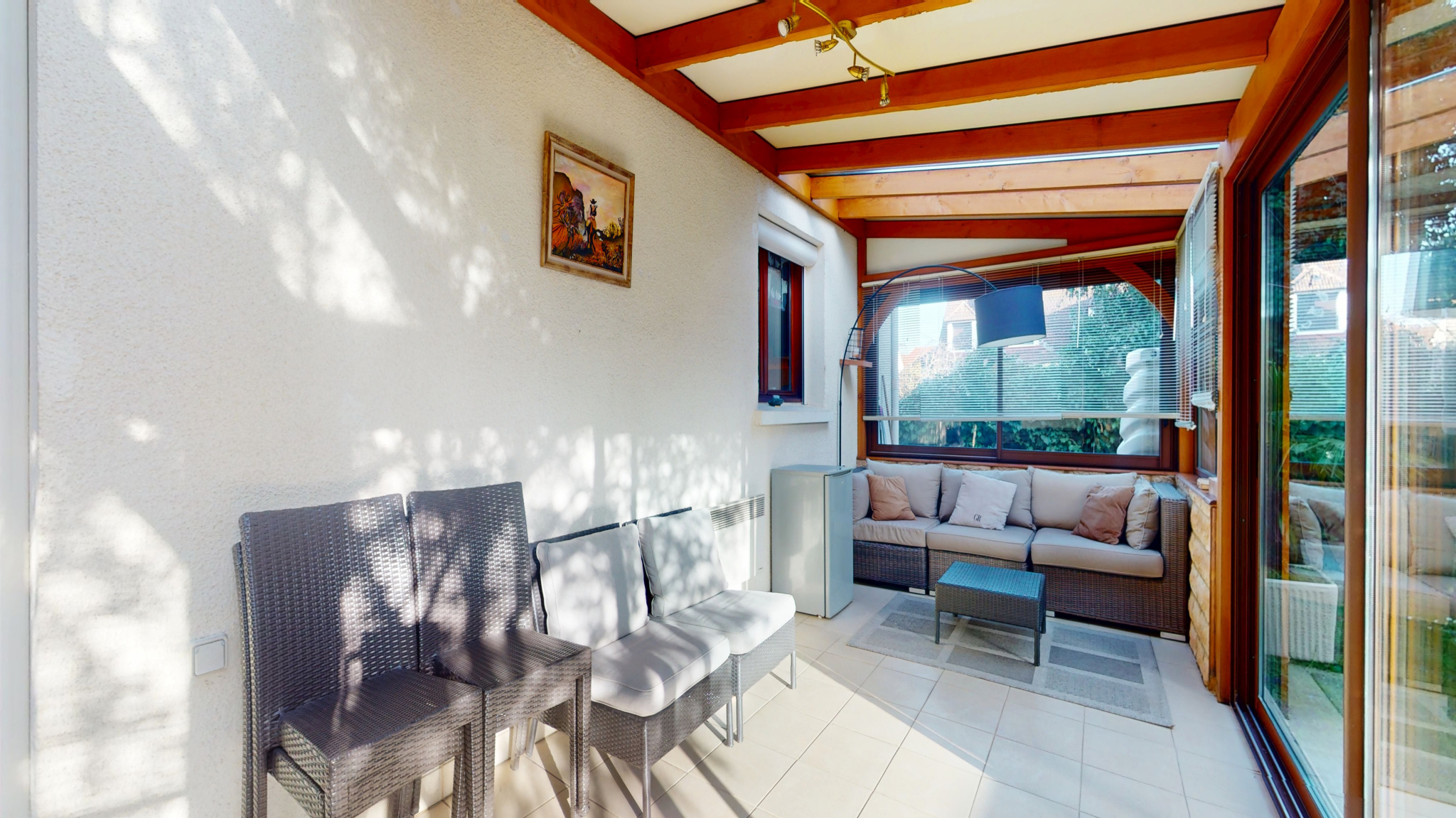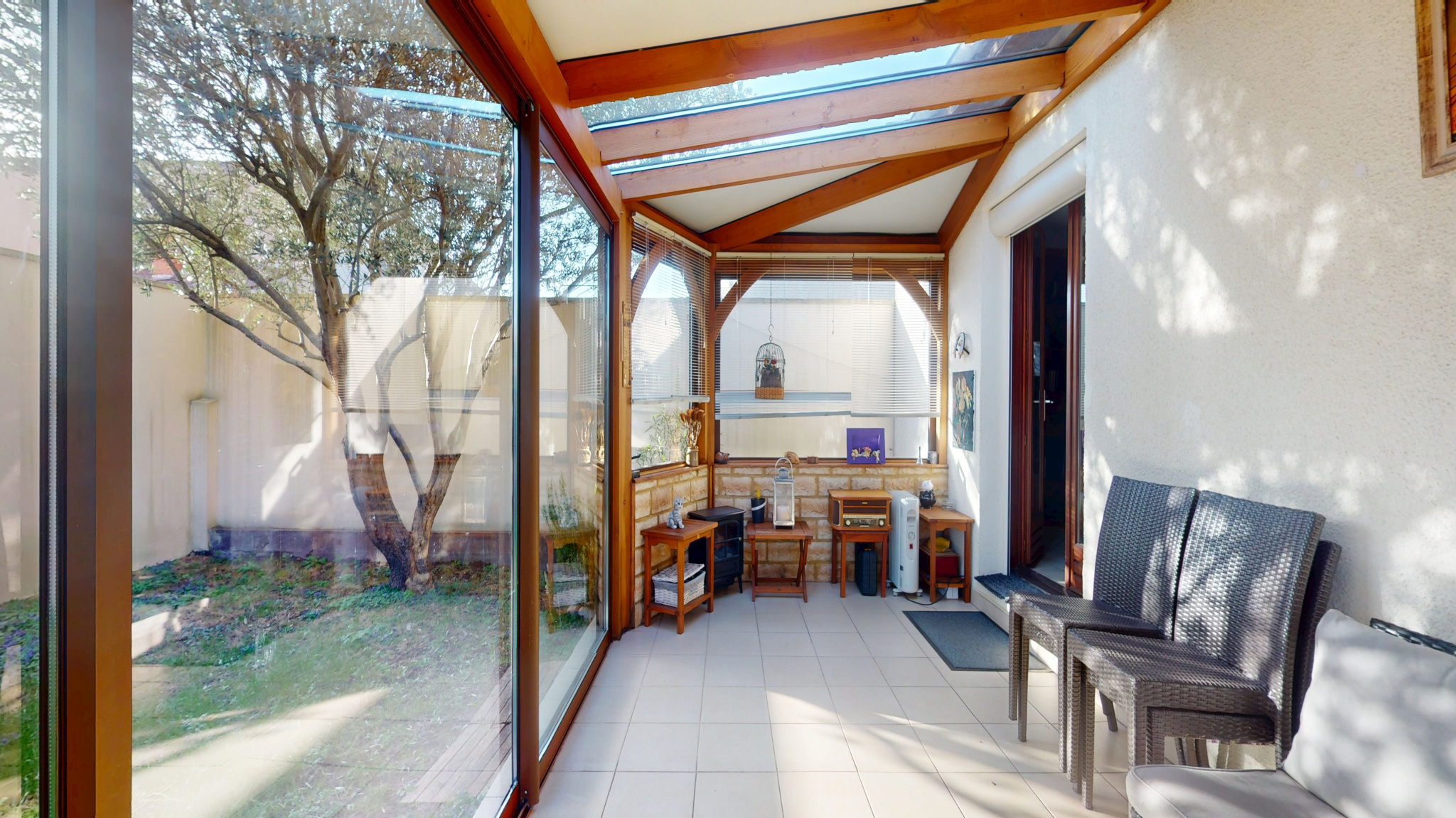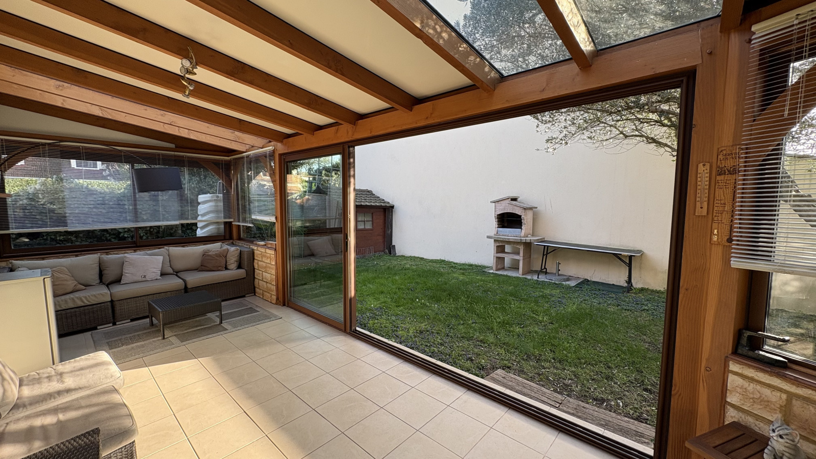 Dès l’entrée, équipée d’un placard intégré, vous découvrez un vaste séjour lumineux et convivial, sublimé par une cheminée à insert, parfaite pour vos soirées d’hiver. La cuisine, récemment rénovée, s’ouvre sur une agréable véranda exposée sud-ouest, véritable pièce de vie supplémentaire baignée de lumière, offrant une vue dégagée sur un jardin intimiste et sans vis-à-vis — un écrin de verdure propice à la détente.