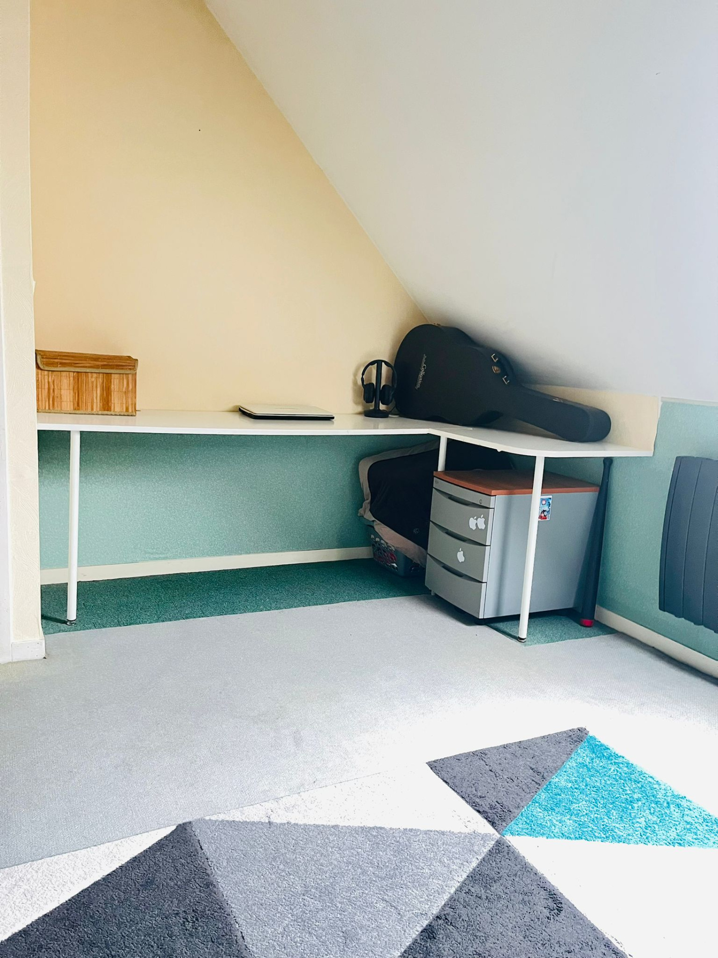 À l’étage, le palier dessert trois grandes chambres avec placards intégrés, ainsi qu’une spacieuse salle d’eau avec WC de 9 m², idéale pour répondre aux besoins d’une famille.