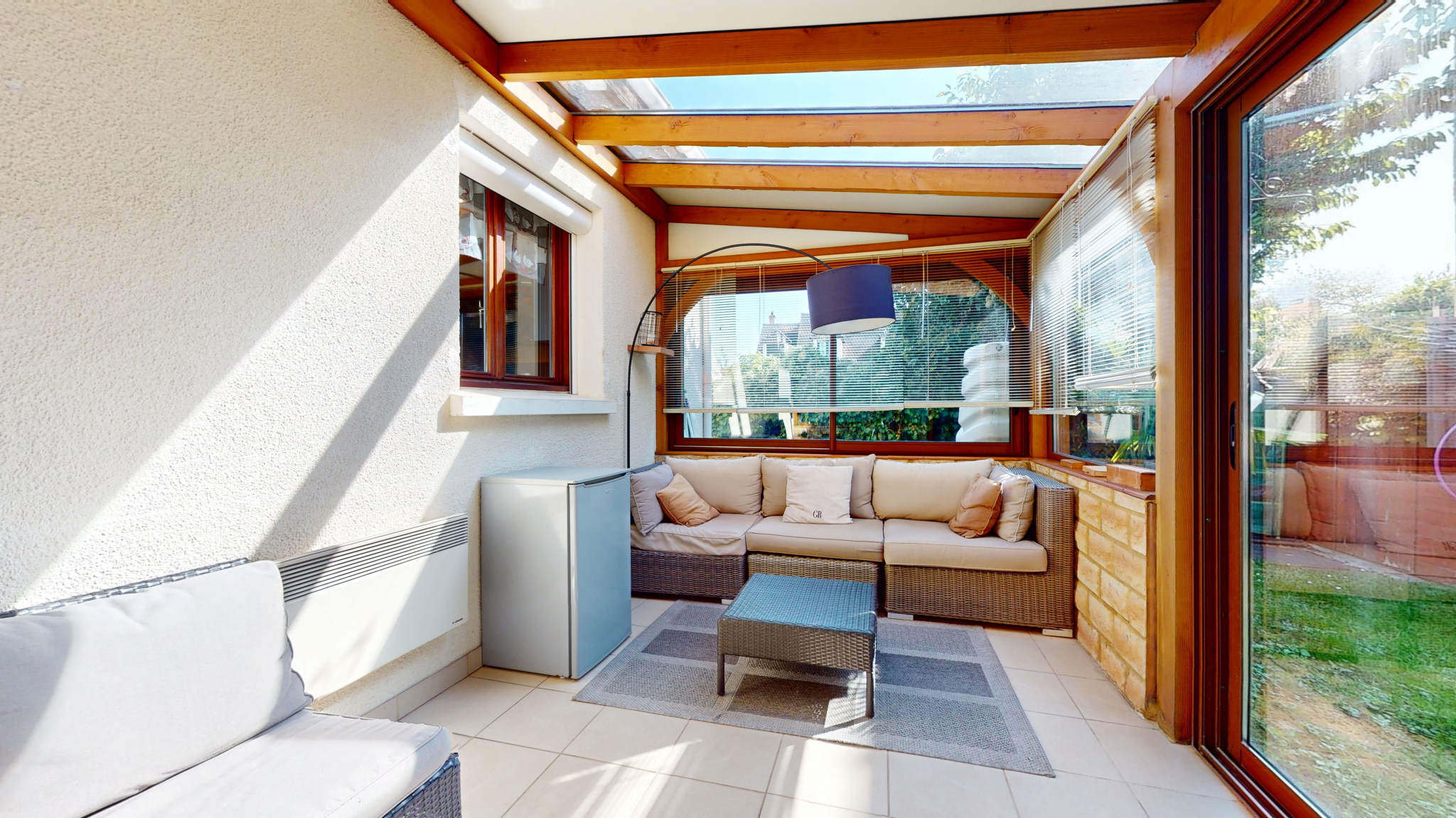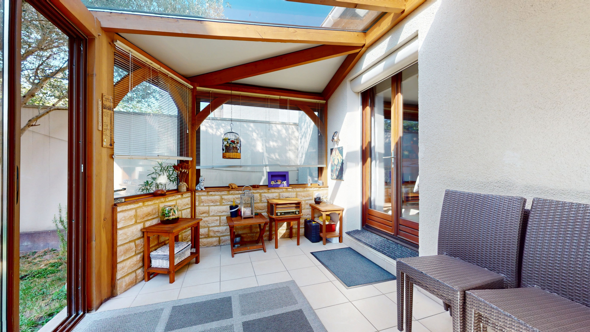 Au rez-de-chaussée, l’entrée avec placard s’ouvre sur un vaste séjour chaleureux agrémenté d’une cheminée à insert, prolongé par une cuisine rénovée ouverte sur une véranda exposée sud-ouest, baignée de lumière et donnant sur un jardin intimiste, sans vis-à-vis.