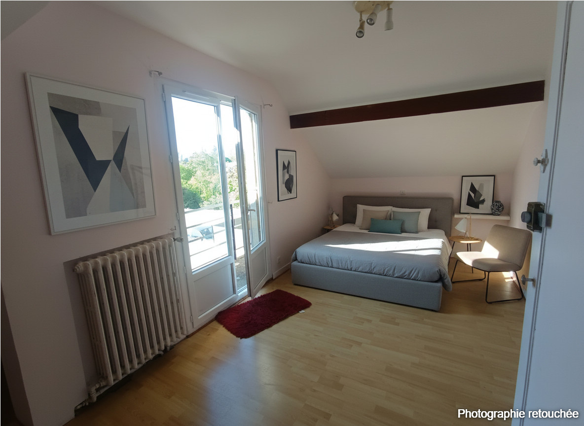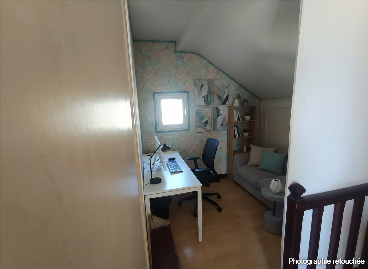 Au rez-de-chaussée : entrée, séjour, cuisine équipée et fermée, une chambre, salle d'eau et WC. À l'étage, le palier dessert un bureau, deux chambres — dont une avec balcon offrant une vue sur La Défense — ainsi qu'une salle de bains avec WC.