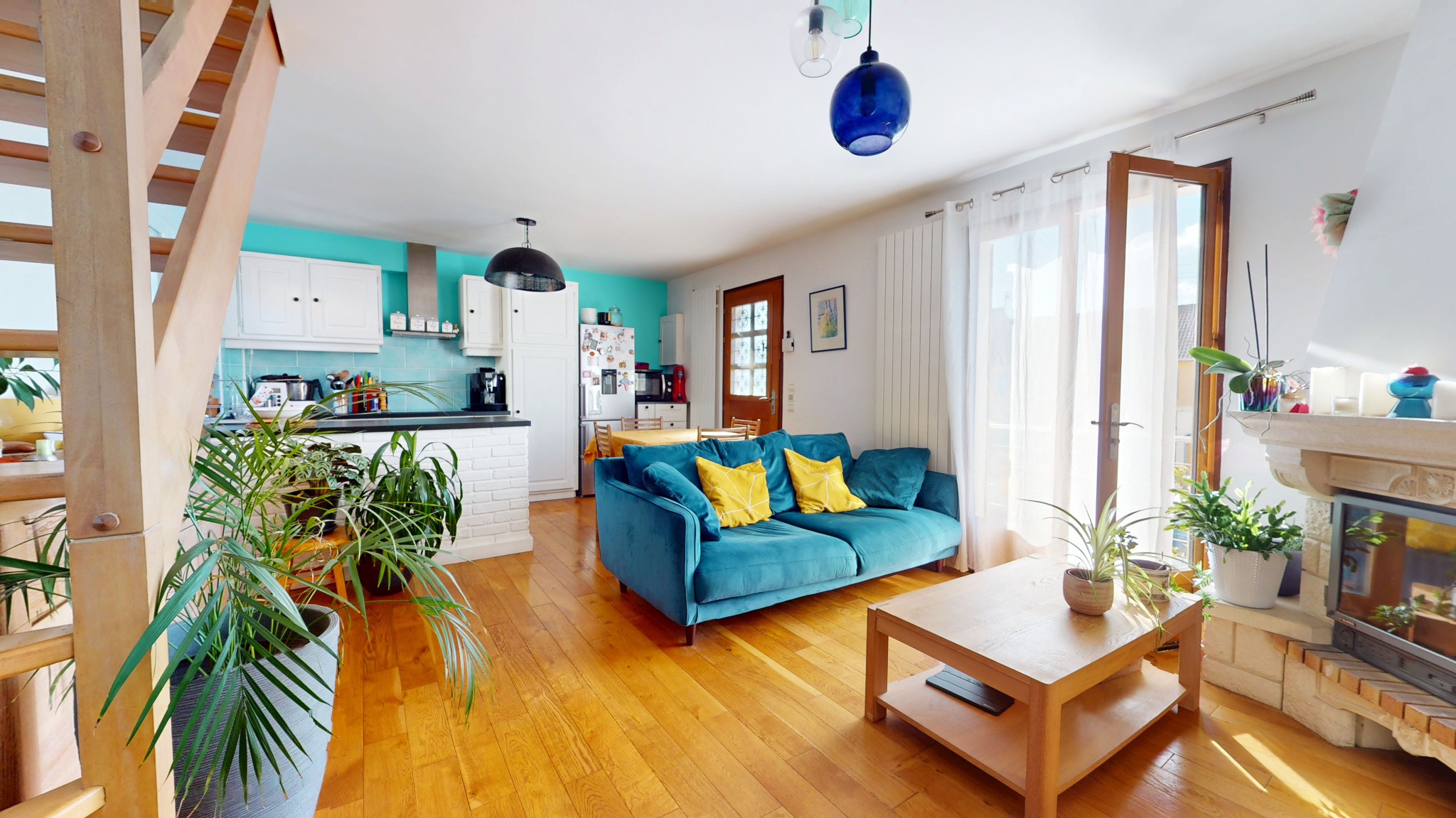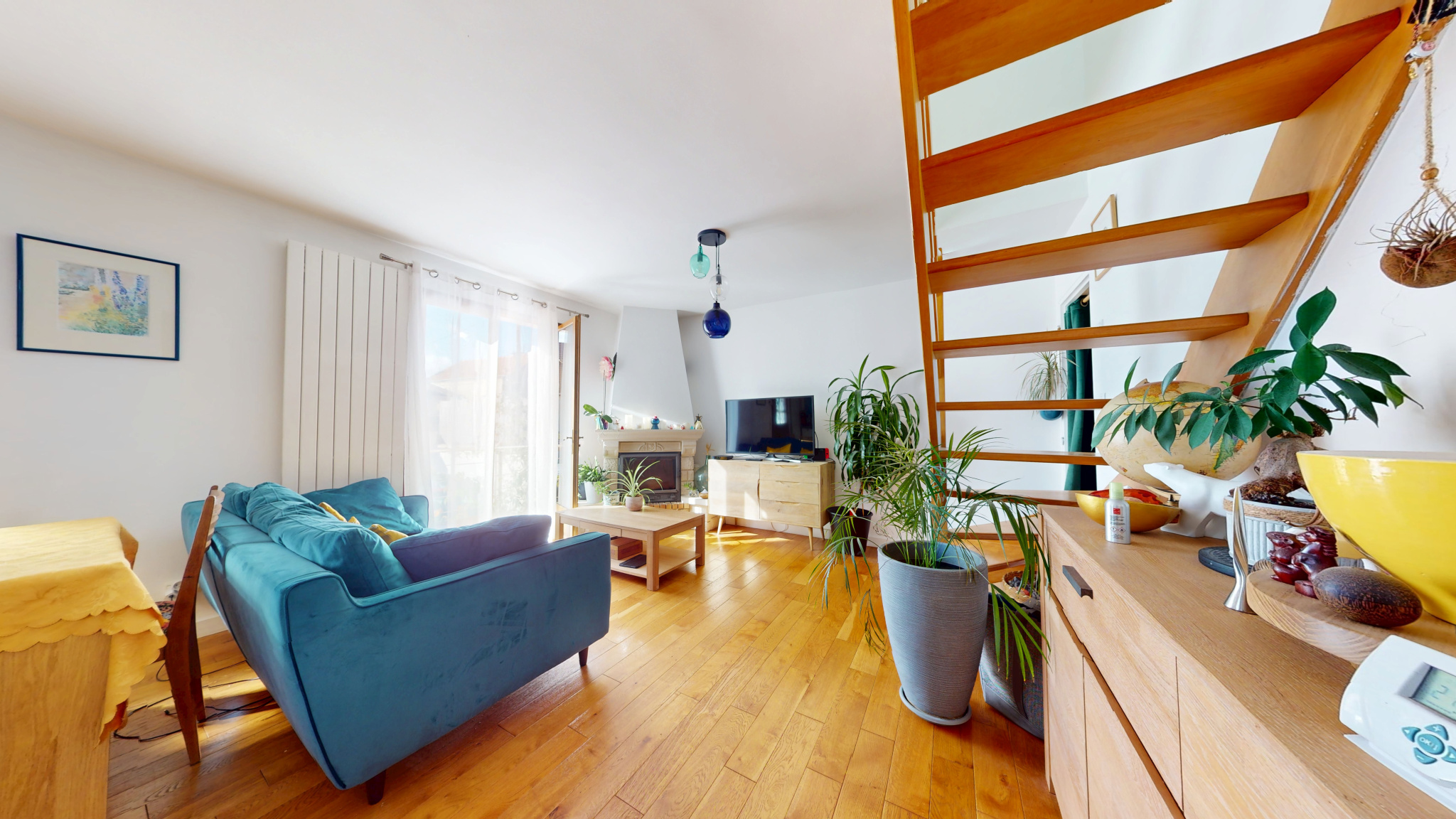 Au rez-de-chaussée, l’entrée avec placard dessert une salle de bains avec WC et une pièce à vivre lumineuse dotée d’une cheminée fonctionnelle et d’une cuisine ouverte. L’exposition plein sud assure un bel ensoleillement et un accès direct au balcon/terrasse qui mène au jardin.