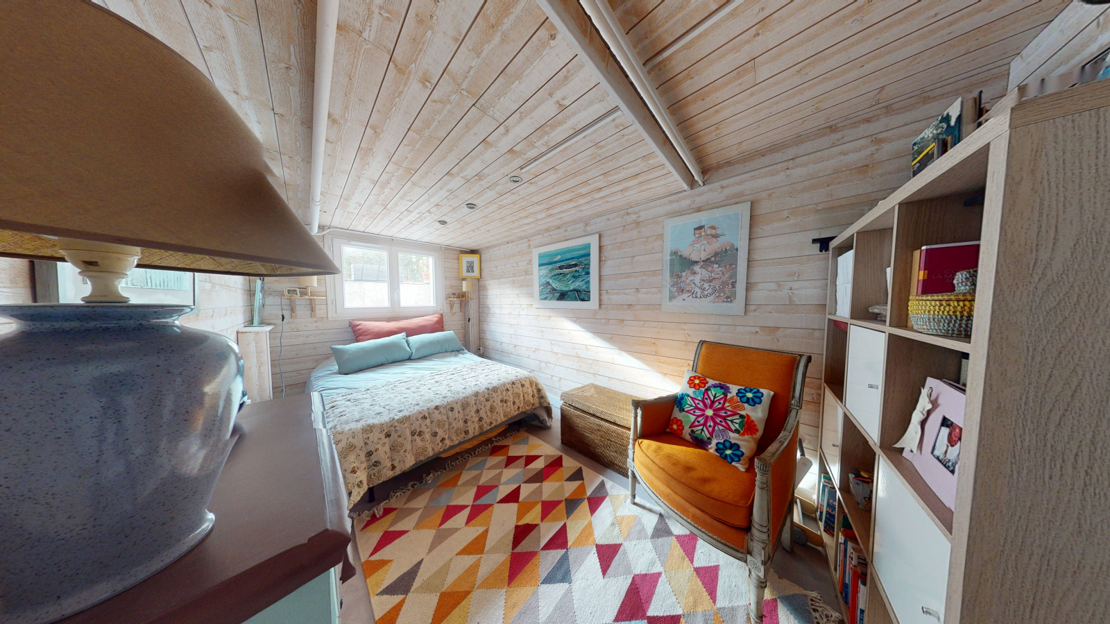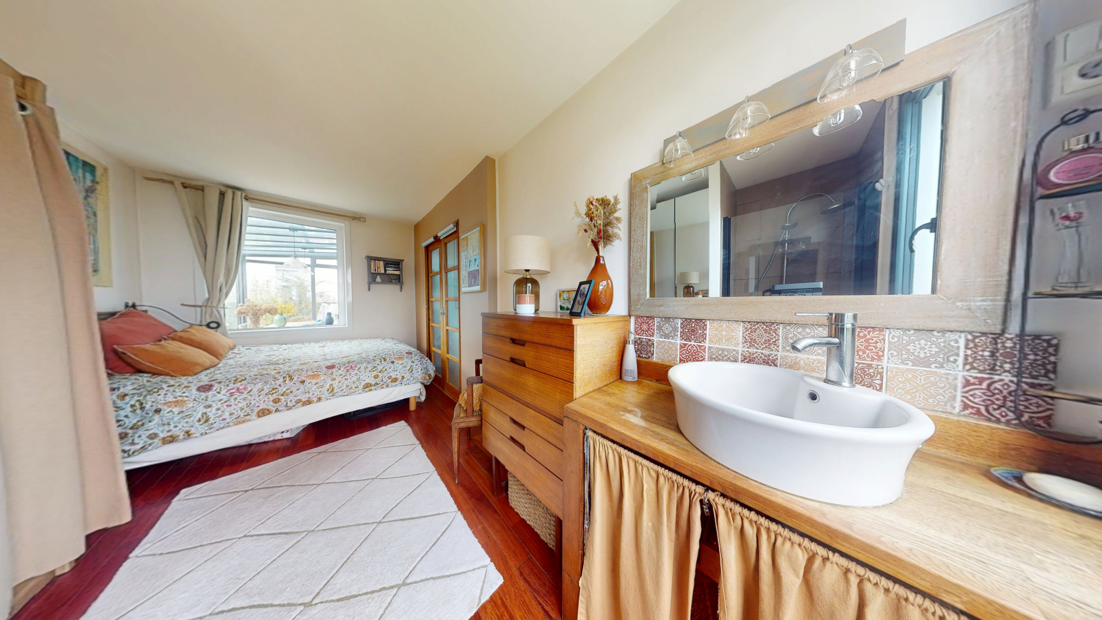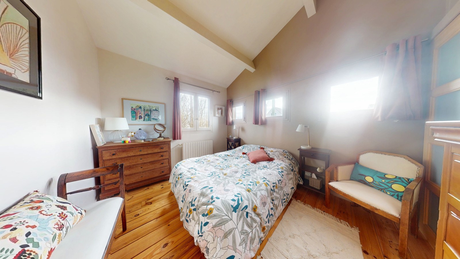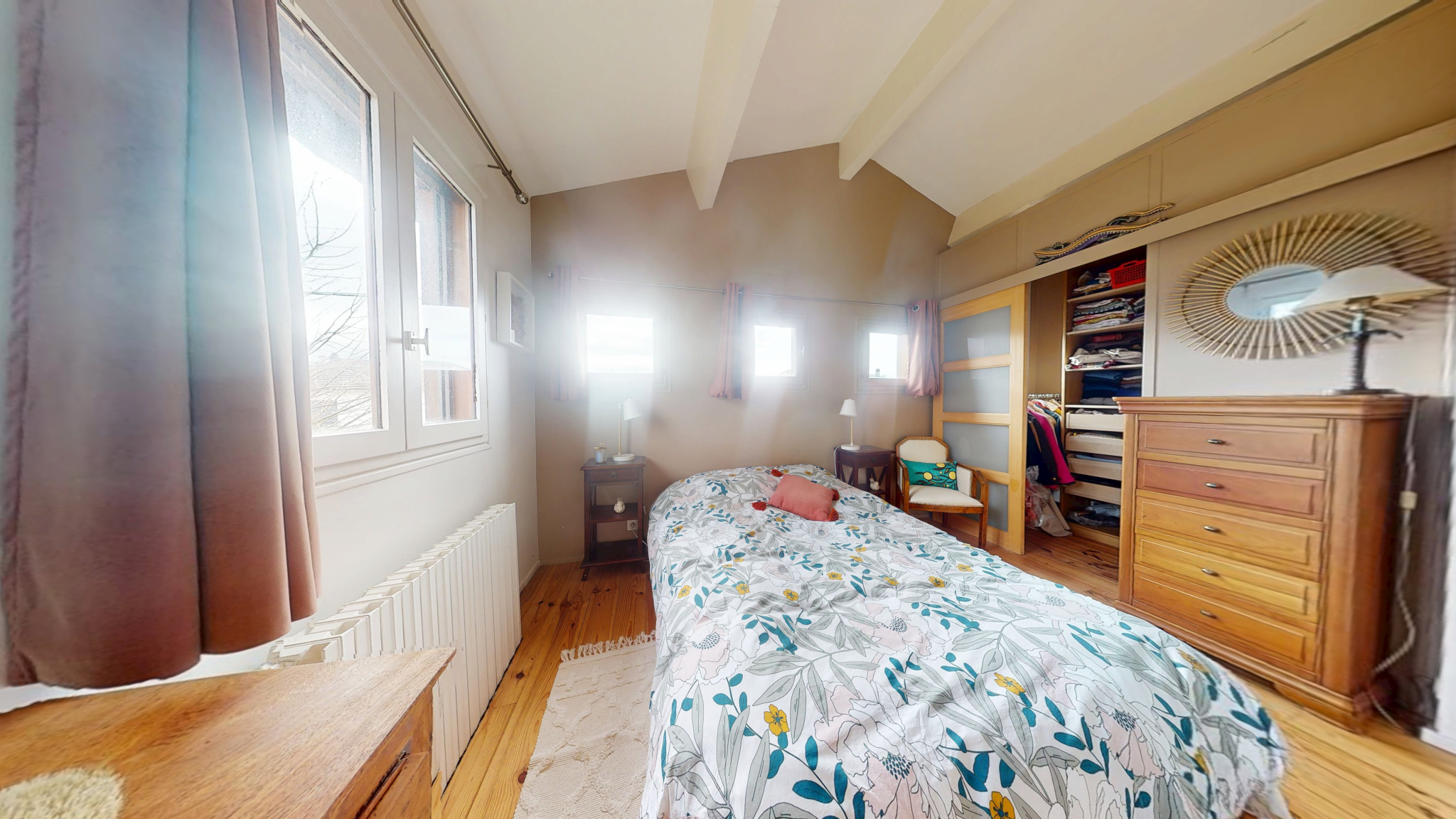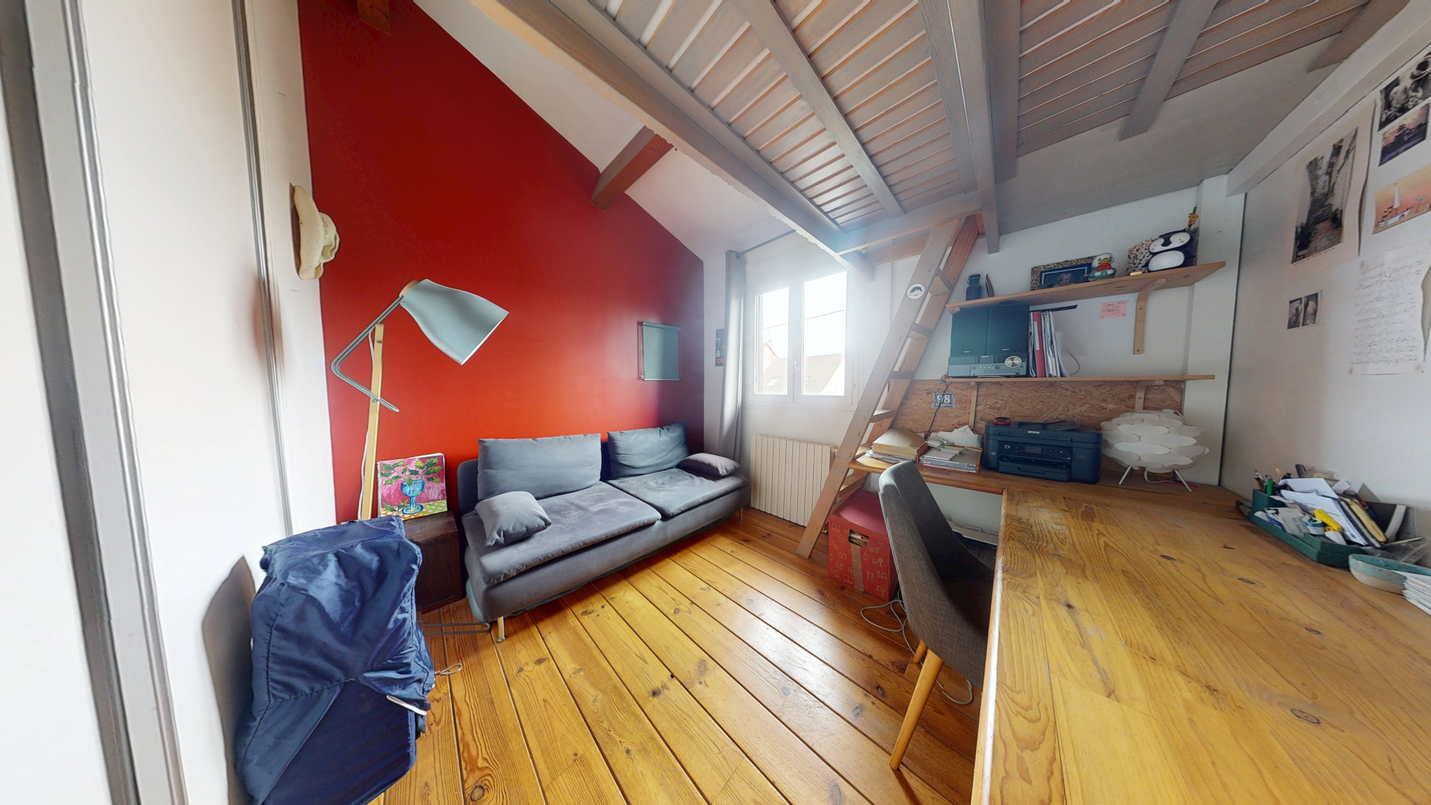 Un palier dessert deux chambres, dont une avec mezzanine (idéal espace bureau ou coin nuit supplémentaire) et une avec dressing. Une salle d’eau avec WC complète l’étage.