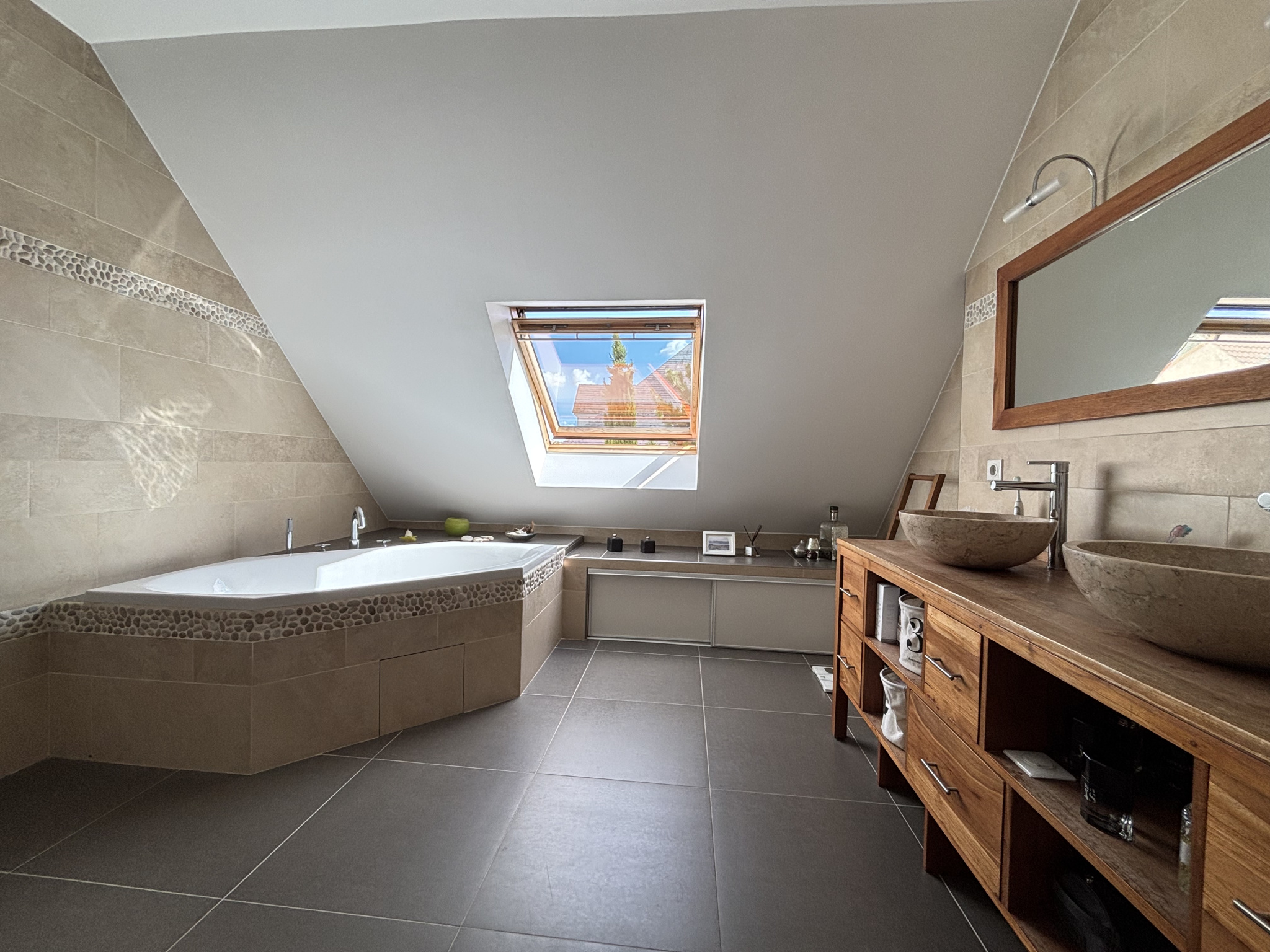 Les combles deplus de 60 m² au sol offrent un potentiel suplémentaire : création d’une seconde suite parentale, deux chambres supplémentaires ou une salle de jeux selon vos besoins.