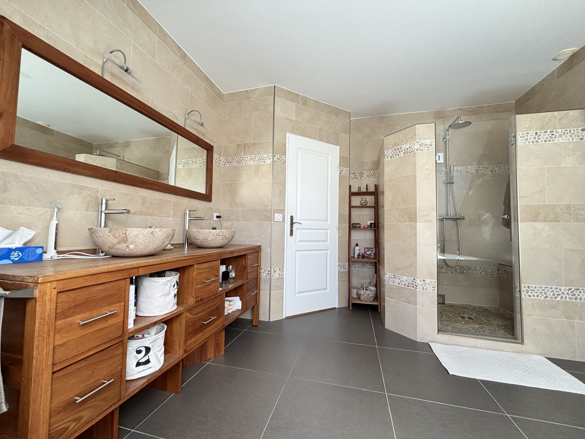 À l’étage, un mezzanine spacieuse pouvant servir de bureau, d'espace de jeux ou de lecture dessert trois chambres avec placard, dont une avec dressing, grande salle de bain (baignoire et douche) et WC.