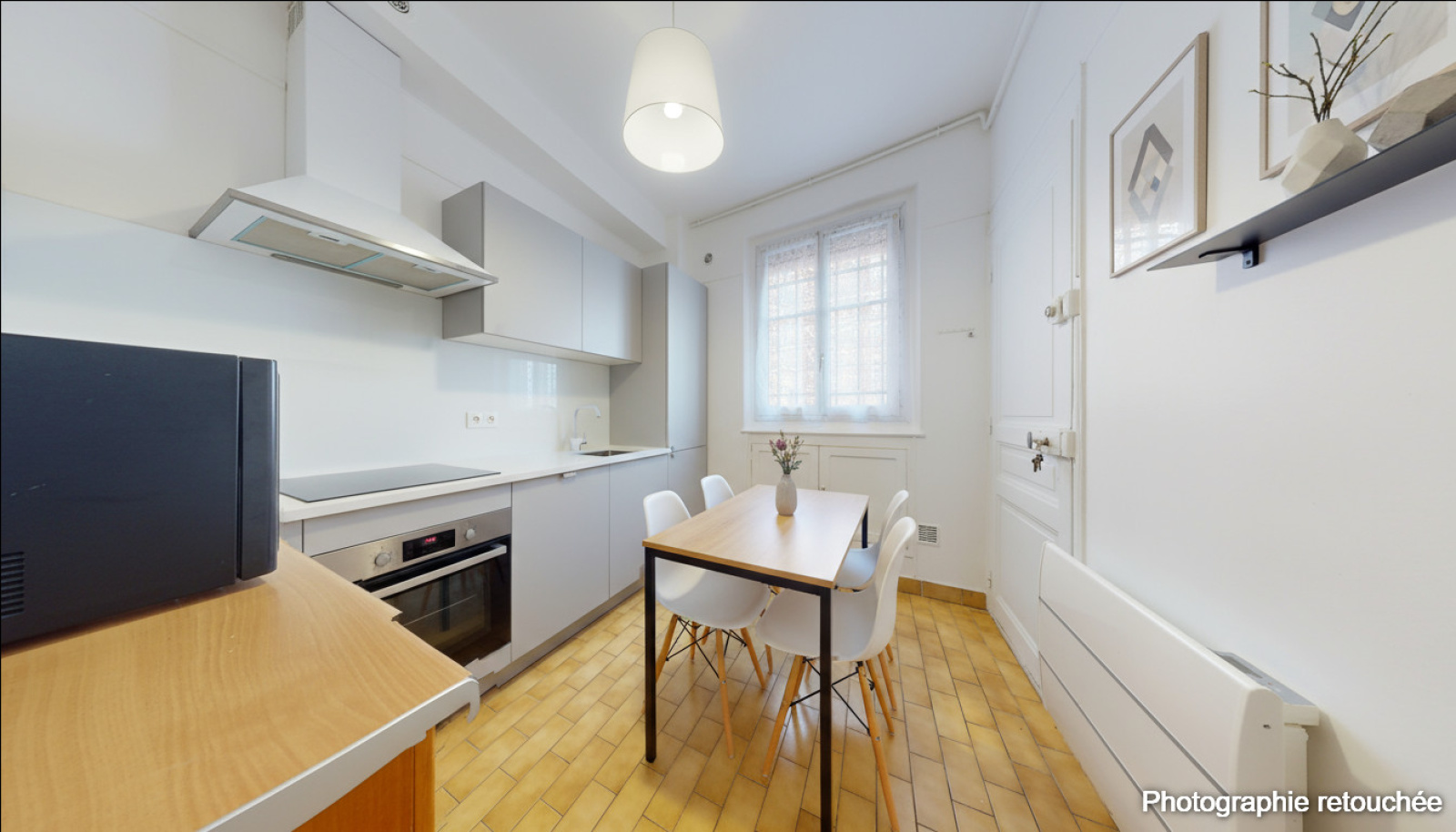 Appartement de deux pièces au 1er étage d'une copropriété avec ascenseur, comprenant: une entrée avec un grand placard, un séjour lumineux, une cuisine séparée dinatoire, une chambre avec placard, une salle de bains avec un espace buanderie et un WC séparé.